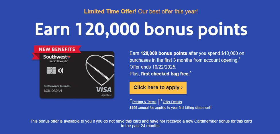 Since this offer is good until October 22nd, if you apply in mid-October and don’t hit your minimum spend until after your December statement closes (or in January to be extra safe), those points will post in January 2026 earning you the Companion Pass for the rest of that year and all of 2027 as well. This all assumes that Southwest makes no changes to Companion Pass earning for 2026, but if that is going to happen, it is fairly likely we will know very soon. The 120k bonus alone is worth about $1,500 in flights so that value plus the Companion Pass potential is very compelling if you plan to travel on Southwest even a few times per year.