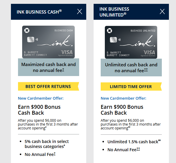 These are both great cards to get and to keep considering they have no annual fee and strong points earning. While billed as $900 cash back, if you have any Chase Ultimate Rewards earning cards such as the Chase Sapphire Preferred or Reserve or Chase Ink Preferred, you can easily combine the earning on these Ink cards with your other card to effectively turn them into 90k Chase Ultimate Rewards points.