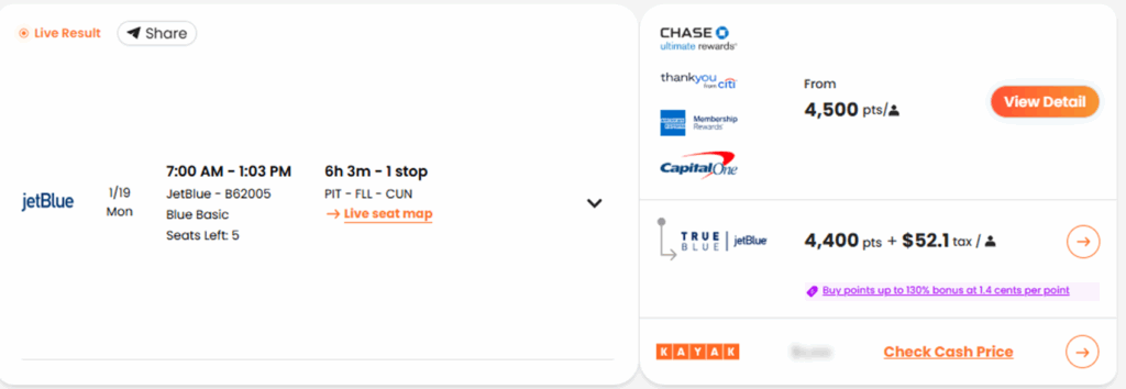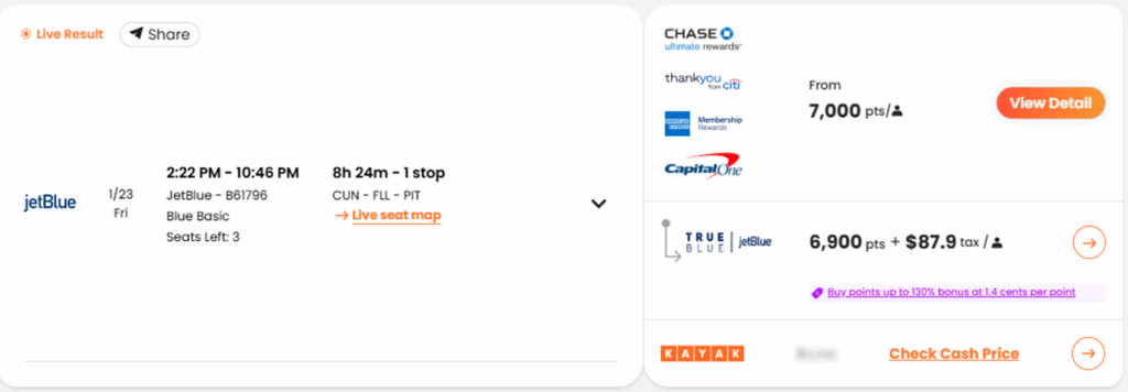 Now, for the flights. I used pointsyeah.com to search a range of dates in January. There were some cheap Spirit flights (no thanks!), but filtering to flights available via Chase Ultimate Rewards transfer partners I found some nice JetBlue options.