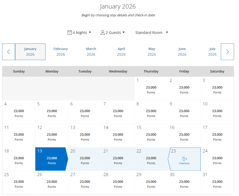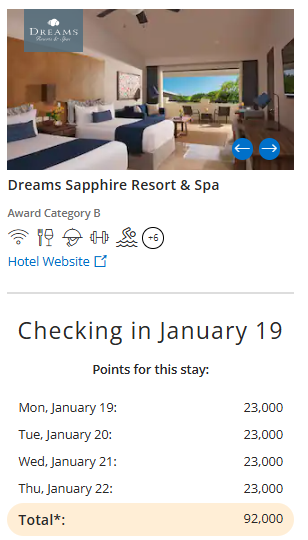 In this case I started with the hotel. I found several Dreams properties (now part of World of Hyatt) available for 23-29k points per night on the Hyatt map view. Once I locked in on the specific property I wanted, Dreams Sapphire Resort and Spa, I checked out the points calendar to see if any dates in January were peak or off-peak. Seeing that every day of the month was 23k points per night gave me flexibility to find the flight options.