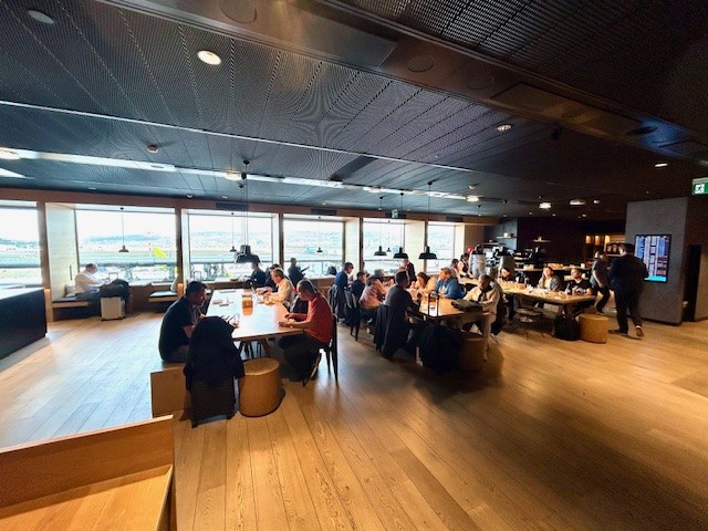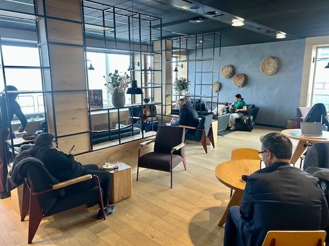The lounge features 96 seats, spread across a few different rooms. We sat at one of the large, communal tables to enjoy the panoramic tarmac views and were happy to find plenty of power outlets underneath the table. In addition to the large tables in the main room, there were a row of more private tables for 2 along the row of windows. On the other side of the lounge was additional seating in a more traditional lounge setup, including fun wood-block tables for drinks or laptops.