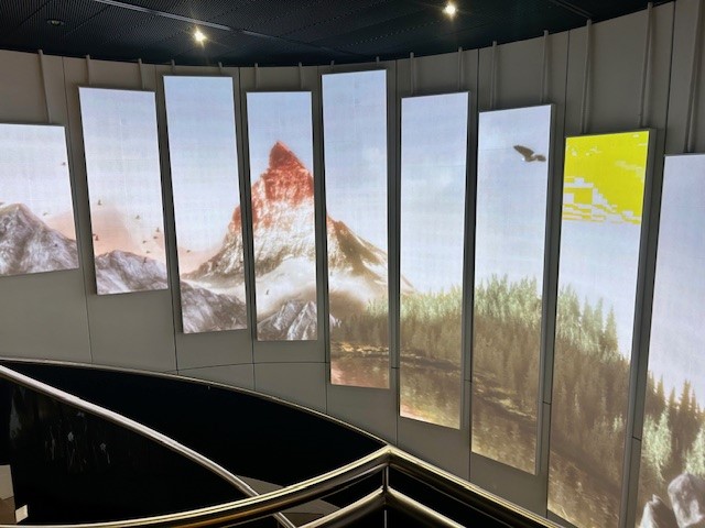 While there are signs overhead directing you to the lounge, it is more conspicuous than most. Located near the transfer desk, you enter through an automatic door that opens to a spiral staircase up to the lounge. The theme is immediately clear with mountain-themed digital panels surrounding the staircase and warm wood elements inside.