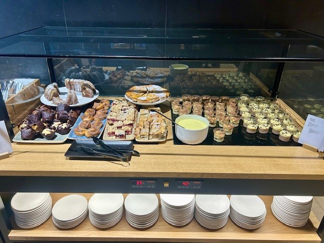 The food selection was pretty broad, with a range of bread, pastries, cereals, nuts, salads with different toppings, soup, candy, chocolate mousse, and tiramisu. They also had a live cooking station that at the time was making fresh pizzas. It was not possible to order a specific type; they alternated between a fish topping and one with ham. We tried a slice of the ham pizza, and it was quite good.