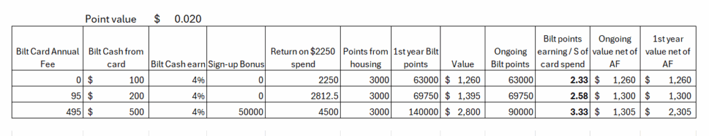 This is where things get interesting. Regardless of which Bilt card you choose, it will still require a decision on which path is best towards earning points for housing payments. Different than the above analysis, here I will vary the monthly spend to show the relative value of “Option 1” levels, and to factor in the different starting amounts of Bilt Cash.