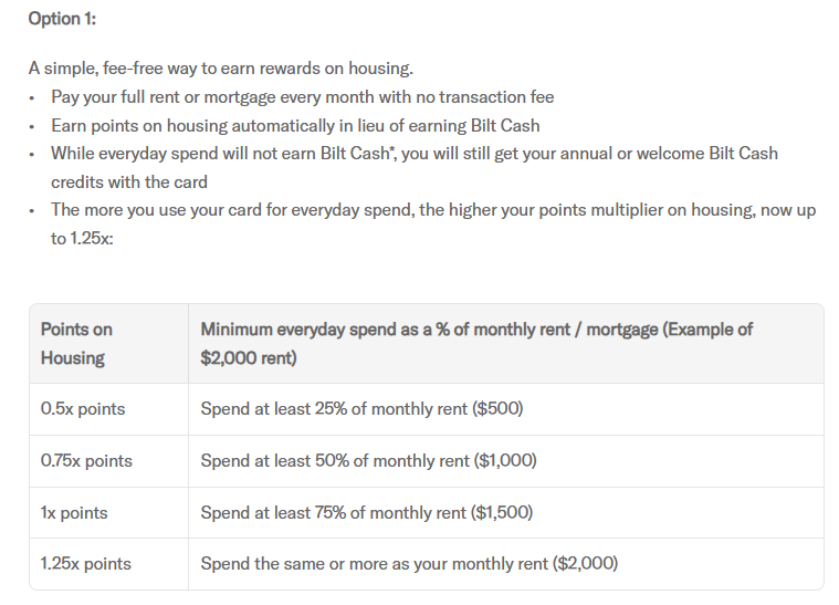 If that wasn’t clear enough, Bilt decided to throw in another option (Option 1) to earn points last Friday, one that doesn’t involve Bilt Cash at all. Now you can earn 0.5, 0.75, 1, or 1.25 Bilt points per dollar of your housing payment based on how much spend you put on your Bilt card per month, regardless of which card you choose. How you choose this option or when/how often you can change between the two is still unknown. Clear as mud? Let’s continue.