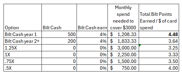 This table shows the amount of Bilt points earned per dollar of spend, ONLY on the housing portion. Not surprising, the first year of the Palladium card earning Bilt Cash is best, because the $500 starting Cash is almost half of the annual total that is required to earn the 3000 points on my mortgage each month.