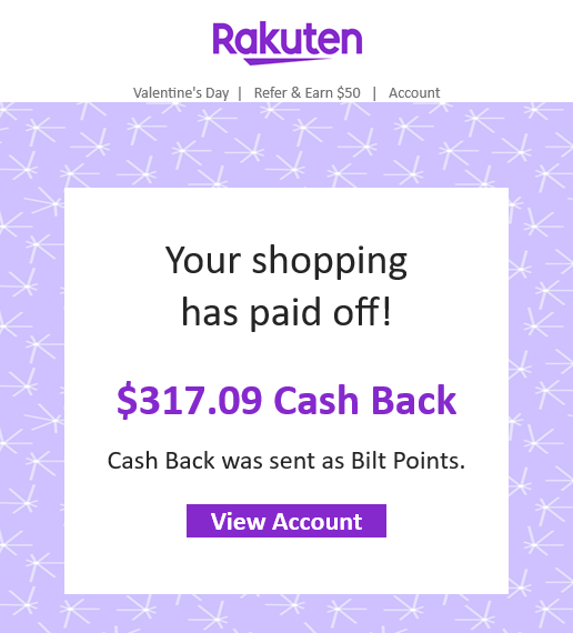 Remember, you can also choose to be paid out in Amex points or Bilt points instead of cash back which can further increase the value. Rakuten has been my go-to shopping portal for the last year and I’ve been happy to earn over 100k Amex and Bilt points.